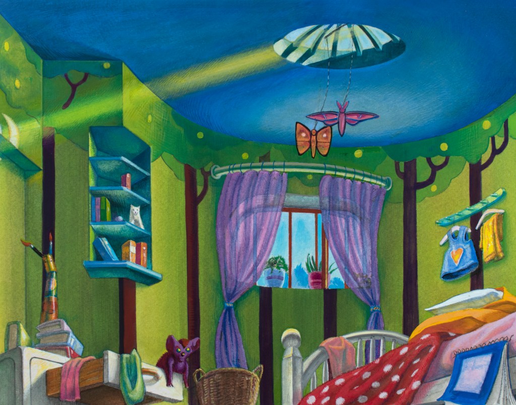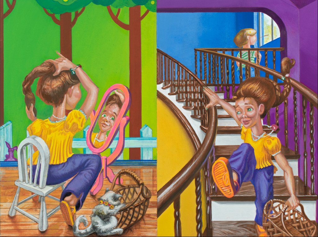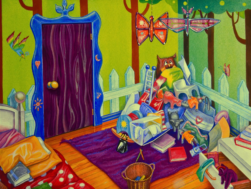 To Emma Everything Was in its Place. Acrylic gouache on illustration board. Image 10 1/8” x 13” (25.7cm x33cm).Emma’s Bedroom Was a Mess. Acrylic gouache on illustration board. 10” x 13” (25.4cm x33cm).This Spring Day is Going to Be Special. Acrylic gouache on illustration board. 10 1/2” x 13” (26.7cm x33cm).